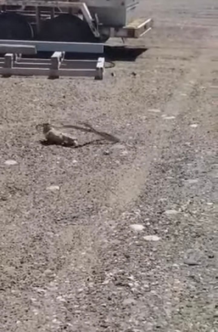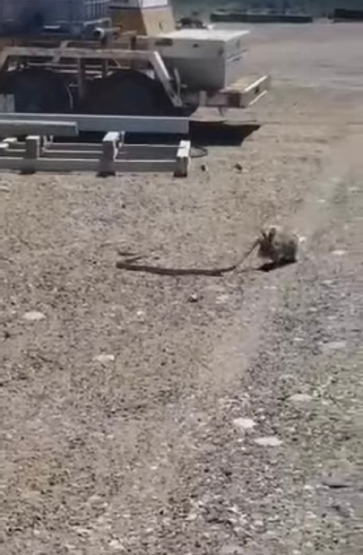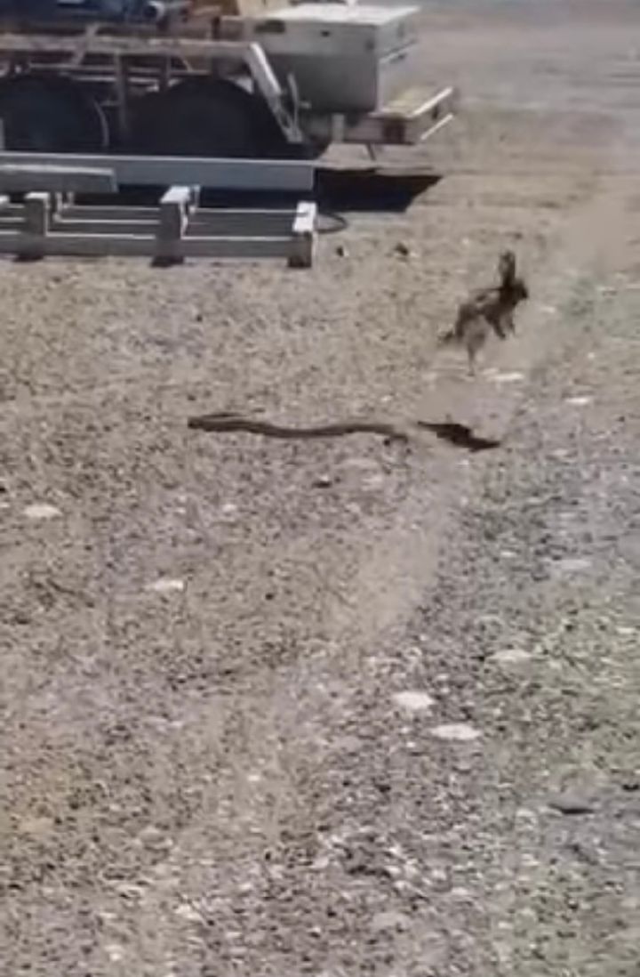 攻撃力を上げようとウサギが飛び跳ねているのか、ヘビが逃れようと必死なのか、暴れる両者。 その間、ウサギはヘビに噛みついたまま離そうとはしません。