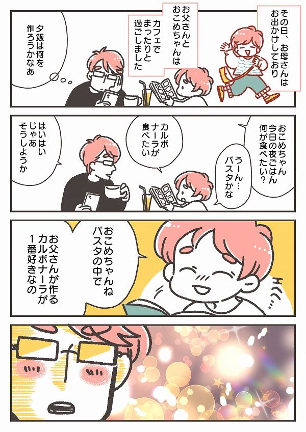 実は夫のカルボナーラは、本格的なレシピのものではなく、代替品も使用したいわゆる「なんちゃって料理」なのですが、なぜか娘に大ヒット。娘はことあるごとにリクエストしてきたのですが、この日は最高の殺し文句もついて、夫は感動のあまり涙まで出そうになったのだとか。私が帰宅したのはちょうど夕飯時。いつも以上に気合の入ったカルボナーラを見ることができました。おいしかったです(笑)