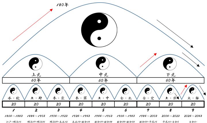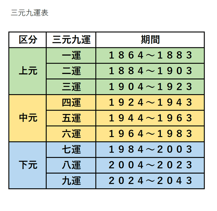 一運の前、九運の後も同様に20年スパンで繰り返されています。