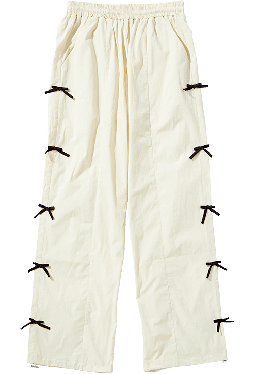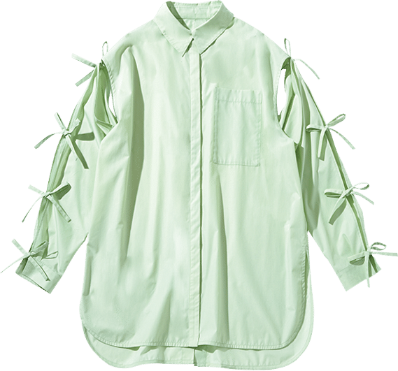 前面と袖にリボンがたっぷりとあしらわれたシャツは、着る側に確かな高揚感を与えてくれる自分“アゲ”服。合わせのアイテムはメンズライクなものを選ぶ、シンプルな着こなしのポイントにするなど、全身ブリブリにならないようにだけご注意を。リボンブラウス¥16,280(pain)、パンツ※メンズ¥41,800(グラフペーパー/グラフペーパー 東京)