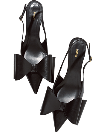 フロントの大きく立体的なおリボンがインパクト大。ポインテッドトウならシャープにはけて◎。ミュール[ヒール5.2㎝]¥16,500(スナイデル/スナイデル ルミネ新宿2店)