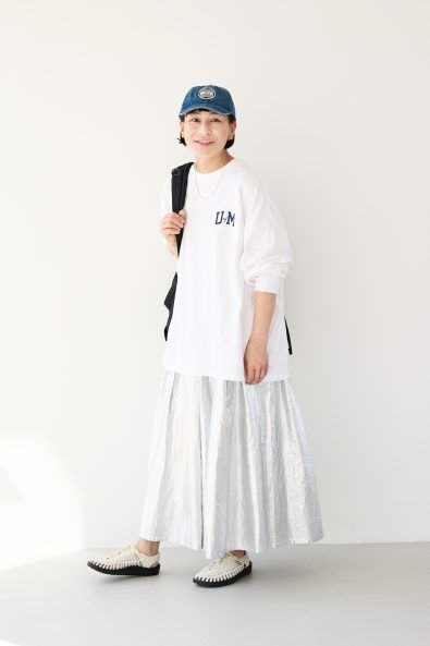 「ドレッシーにならないように、Tシャツやキャップ、バックパックなど、少しスポーティなアイテムを取り入れて全体のバランスを意識しました。シルバーのスカートは、はくだけで旬な着こなしに仕上がるところはもちろん、たっぷり長さがあるところも気に入っています」