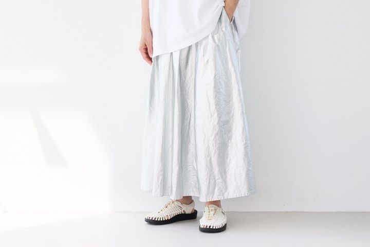 上品なスカートに、アウトドアサンダルを合わせて、ほどよく抜け感を演出。シルバー×白でまとめることで、洗練された足もとに仕上がります。