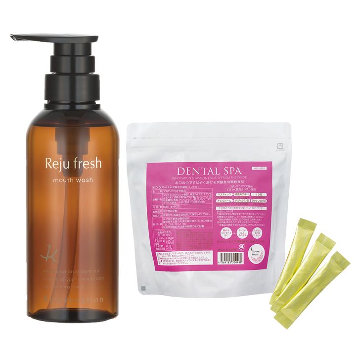 左:ゆすぐ必要のない洗口液で、口腔内の菌バランスを常にキープ。リジュフレッシュ 300ml ¥5,500(リジュベネーション)