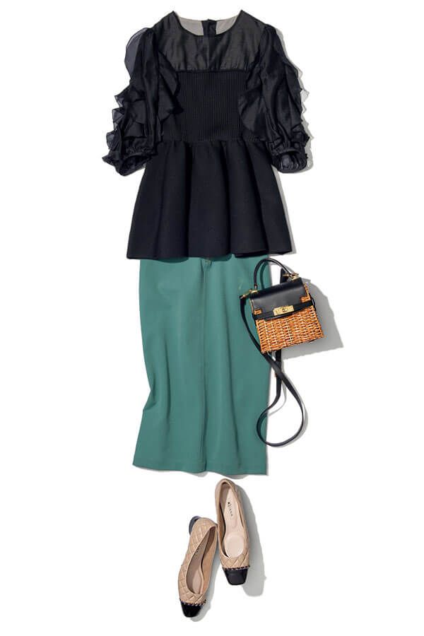 黒×グリーンの大人クールな配色が新鮮。ボトムをスッキリとさせることで、チュニックのボリューム袖が優雅に引き立ちます♡