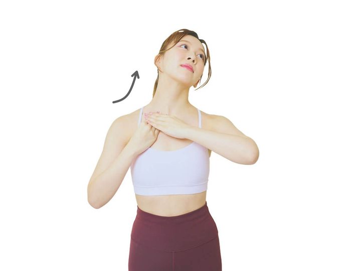 吸う息で鼻先と目線を斜め上の天井に向ける。クロスした手は下に引っ張りながら、鎖骨と鼻先を遠ざけるようなイメージで!
