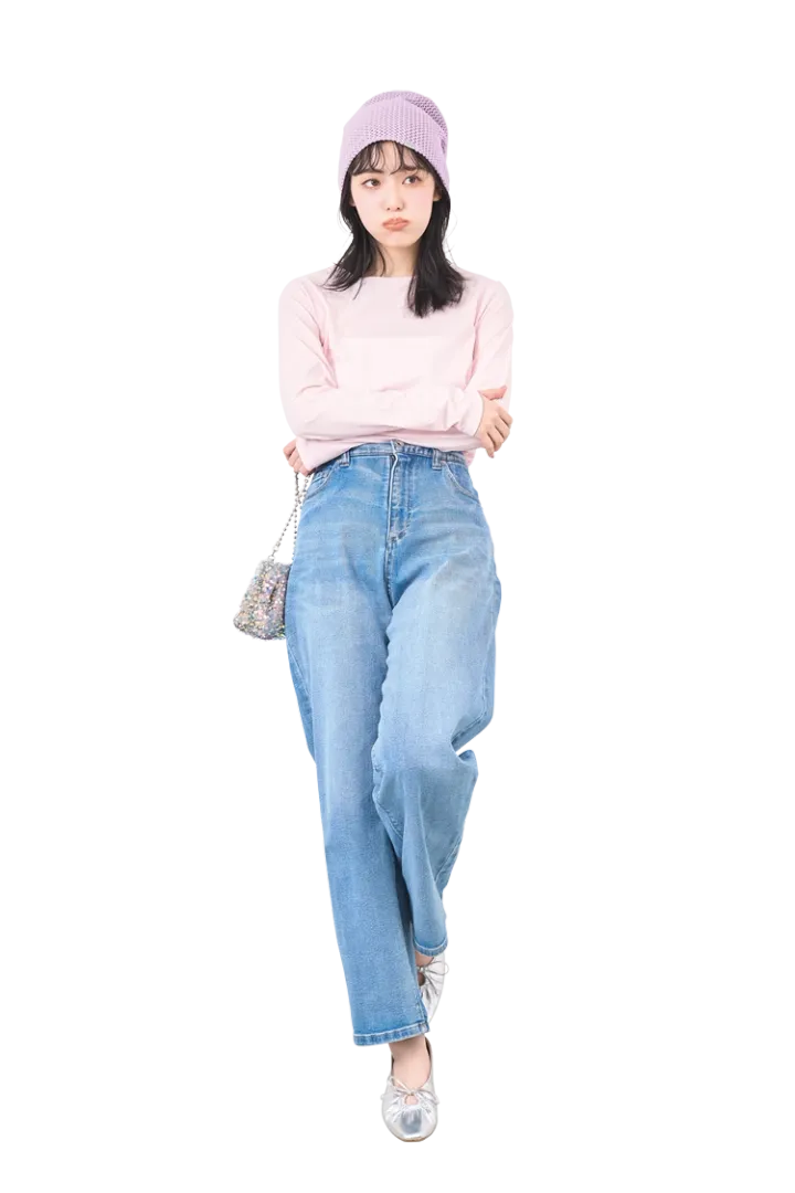 ロンTは着回し。デニムパンツ 6,589円/ROPÉ PICNIC(ジュン) ビーニー 4,950円/OVERRIDE(OVERRIDE 神宮前) バッグ 4,389円、パンプス 5,940円/ともにROPÉ PICNIC PASSAGE(ジュン)