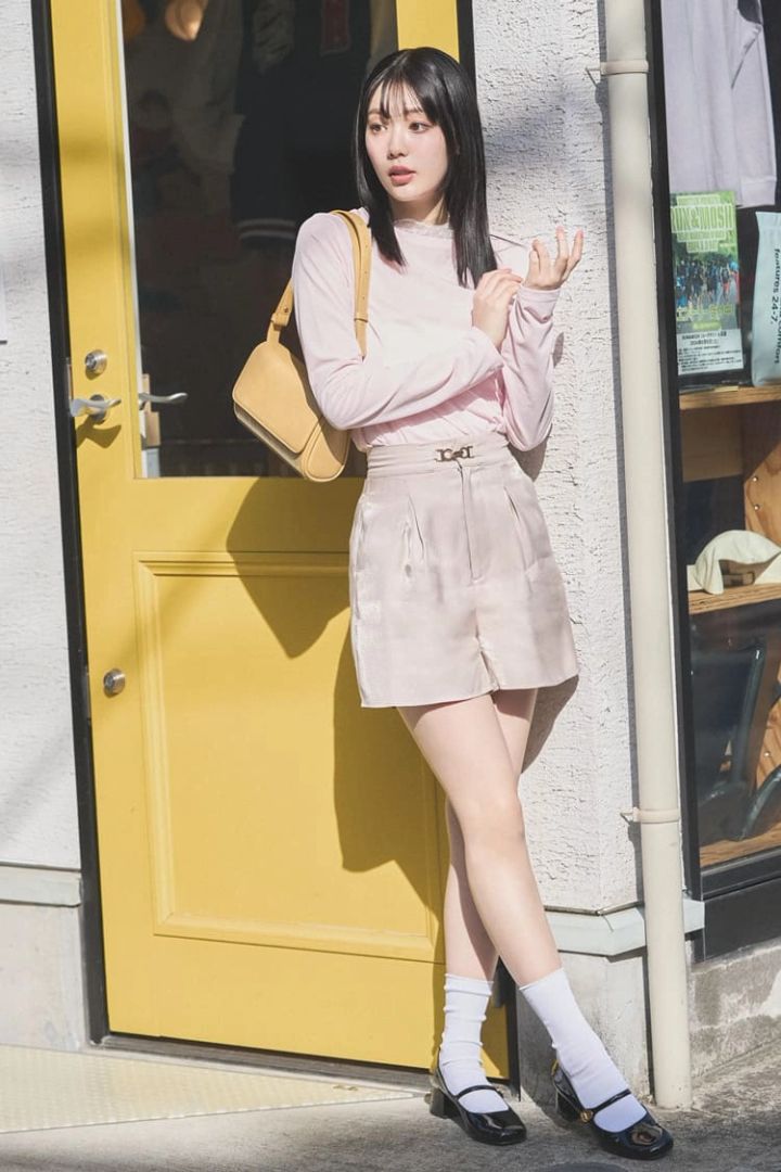 ロンTは着回し。リボン柄シアートップス 2,199円/PHILLY ベージュショートパンツ 7,590円/dazzlin バッグ 14,228円/STAND OIL(MUSINSA GLOBAL STORE) ソックス 990円/靴下屋(Tabio) パンプス 9,500円/チャールズ&キース(チャールズ&キース ジャパン)