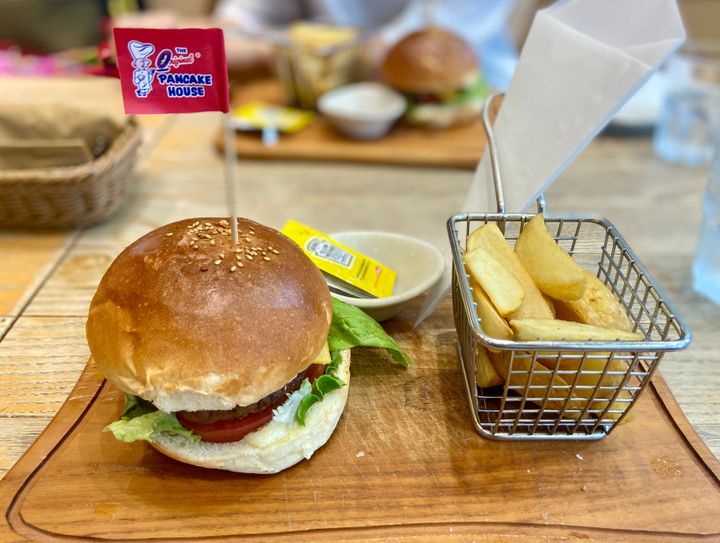 寝起きでがっつりハンバーガーとパンケーキを頂きました😂