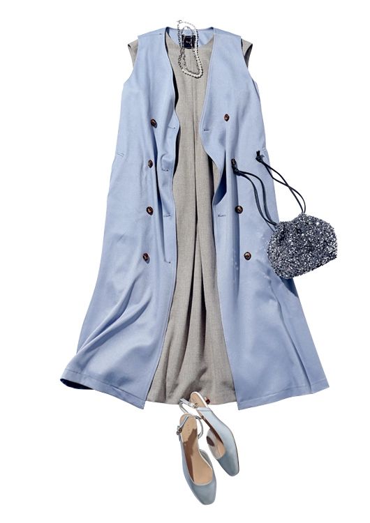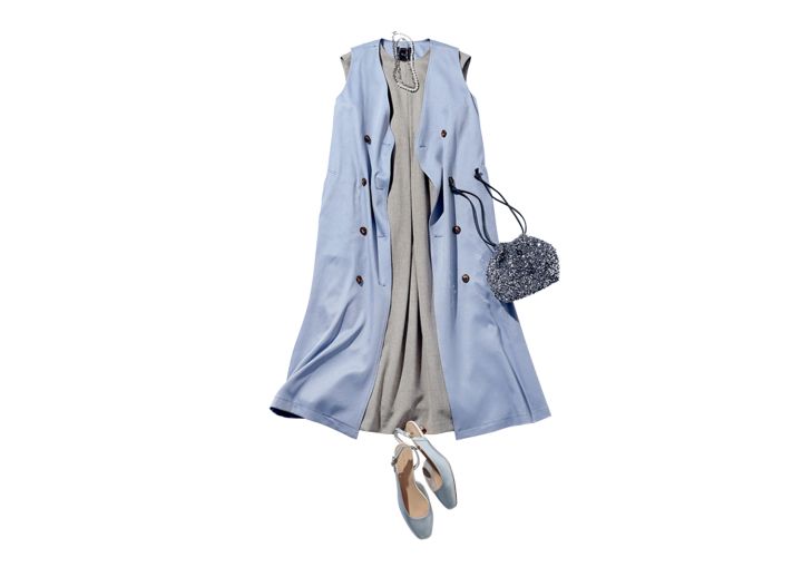 ブラウス付きワンピース(ワンピース)¥19,910/ミラ オーウェン ルミネ新宿2店 3WAYトレンチ¥24,970/Swingle 有楽町マルイ店 シルバーパンプス¥17,600/Stola. スパンコールバッグ¥5,940/カシュカシュ(アンビリオン) ネックレス(2本セット)¥990/GU