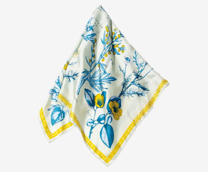 エフォートレスなスタイルを提案する〈レキップ〉が、ヴィンテージスカーフを着想源とするブランド〈マニプリ〉に別注したシルクスカーフをリリース。中世の銅版画のような線画タッチで描かれた草花が印象的なアンティークフラワー柄は、普段使いしやすい淡い色合い。ベースは写真のライトブルーと、オフホワイトの2色。ほかにボタニックガーデン柄も。