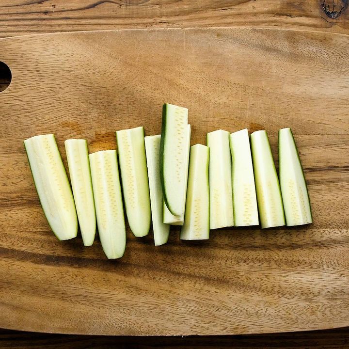 1: ズッキーニは横半分に切ってから、さらに縦6等分に切ります。
