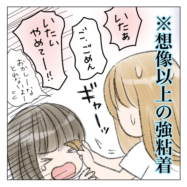 粘着テープはかなり強くしっかりくっつくようになっているのでそのまま使うのではなくくっつく面積を減らしたりするといいと言われていました。