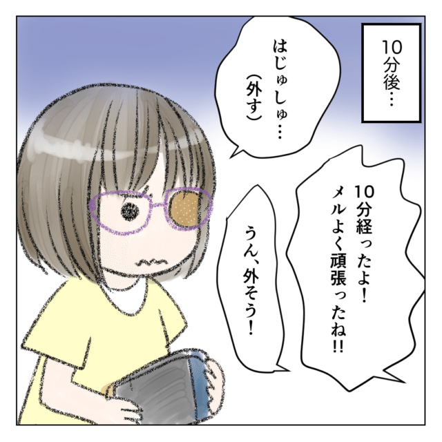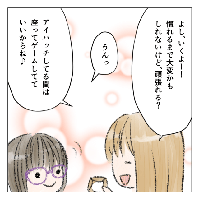 デジタルゲームが視力の発達に役立つこともあると知り目から鱗のみやーんさん。検診から帰宅後、さっそくアイパッチをやってみるか聞くと「やるー!」とやる気満々なメルちゃん。最初だし10分でも20分でもいいからとやってみることに・・・。
