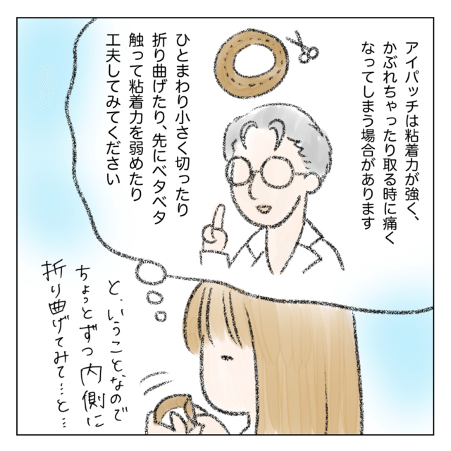 アイパッチは絆創膏が丸くなったようなつくりで、粘着テープの中心にガーゼがついているような感じです。