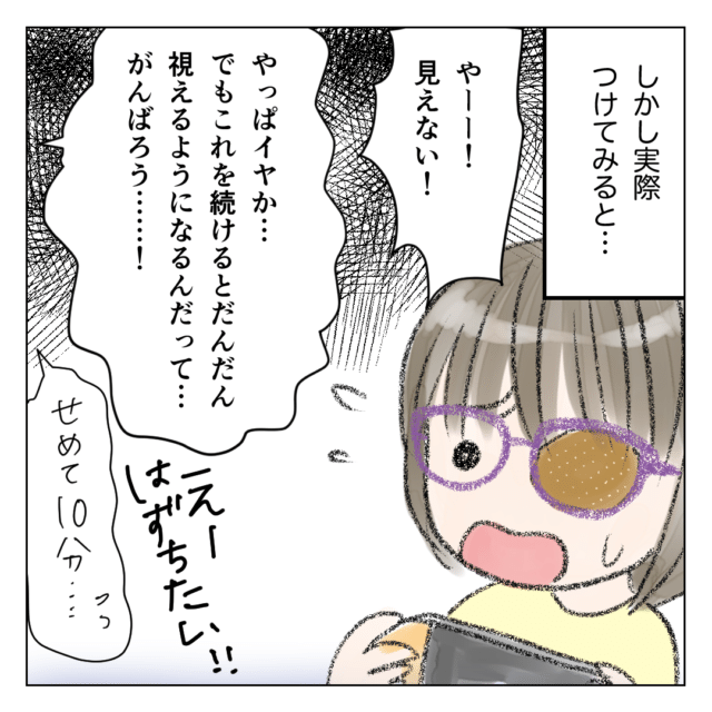 3. [26]「見えない!はずしたい!」嫌がる娘と強粘着なアイパッチに悪戦苦闘・・。娘の弱視に気づかない|みやーんの育児漫画