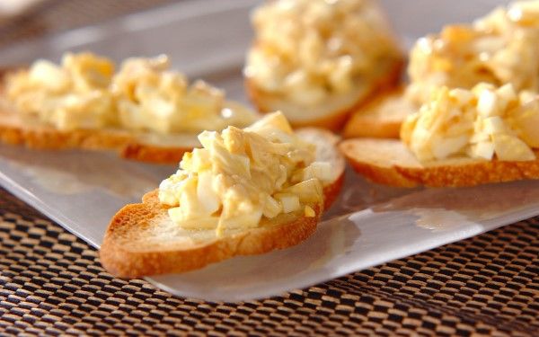 トーストしたフランスパンに、らっきょうと混ぜたゆで卵をトッピング。らっきょうの歯ごたえが心地良く、ピリッとしたユズコショウが全体の味を引き締めます。おつまみやオードブルにおすすめです。