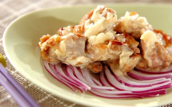 こんがり焼いたひと口サイズの鶏肉を、らっきょうタルタルで和える一品です。ほんのりユズコショウを効かせるため、見た目よりもさっぱりといただけます。紫玉ネギの上に盛れば、サラダ感覚で食べられそうですね。