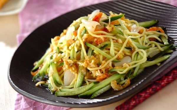 らっきょう、キュウリ、干しエビにネギダレソースを合わせます。冷やし中華のようにさっぱりといただけます。らっきょうの風味と食感がいい味を出し、暑い季節に最適な一品です。