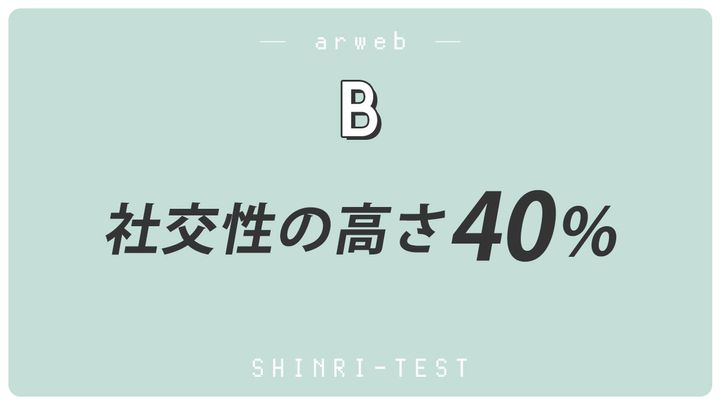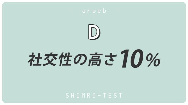 あなたの社交性はやや低めで、人の好き嫌いがはげしい一面も。好きな人とはとても仲良く、どっぷり親しくなりますが、苦手な人とはあいさつする時もあまり声は出さないときも…?できれば好きな人とだけ付き合いたい、というのが本音でしょう。でもそういうわけにもいかず、苦手な人とも接しなければならないとストレスがたまります。