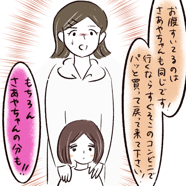 「お腹すいているのはさあやちゃんも同じです!行くならそこのコンビニでパッと買って戻ってきてください!