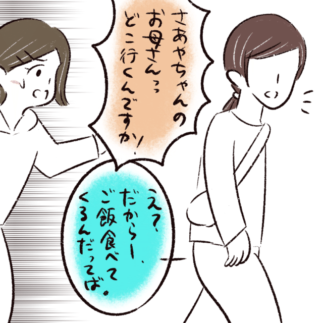 保育園の先生が慌てて引きとめようとしても、さあやちゃんママはむしろ「え?」という反応です。