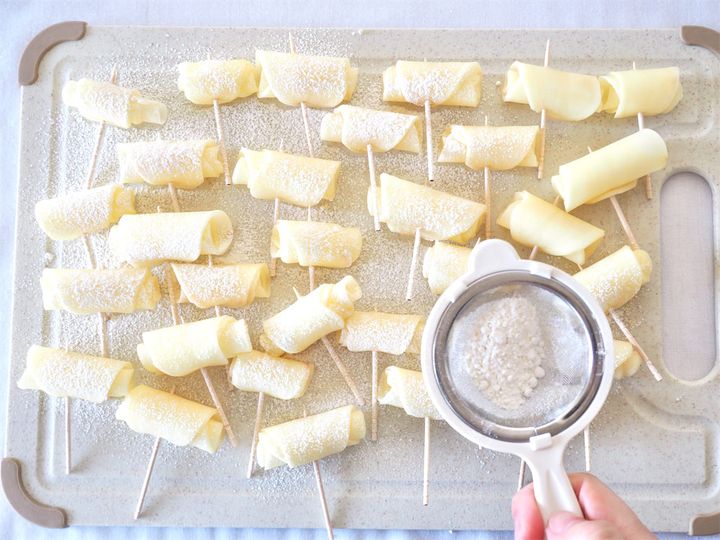 7.  6のじゃがいもの表裏全体に薄力粉をまぶしていく。