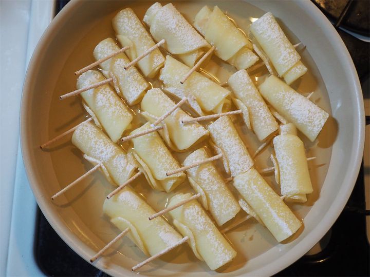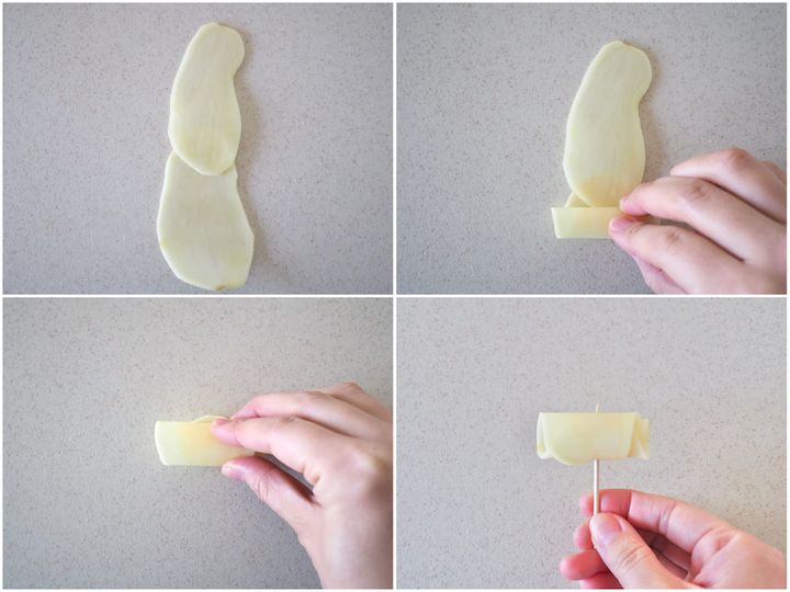6.  5のじゃがいもの水分をキッチンペーパーで拭き取り、1枚、または2枚使って縦に少し重ねて巻いていく。巻き終わりは爪楊枝を刺しておく。