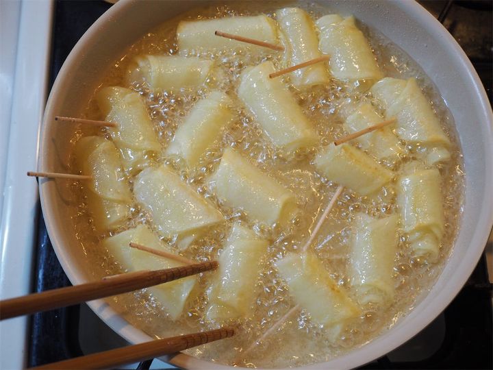 9.  中火から弱中火で5分くらいずつ両面を揚げる。