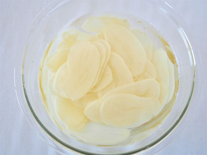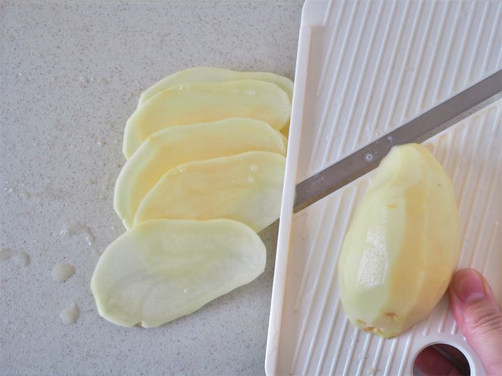3.  じゃがいもの皮を剥き、スライサーを使って縦長に薄切りにする。