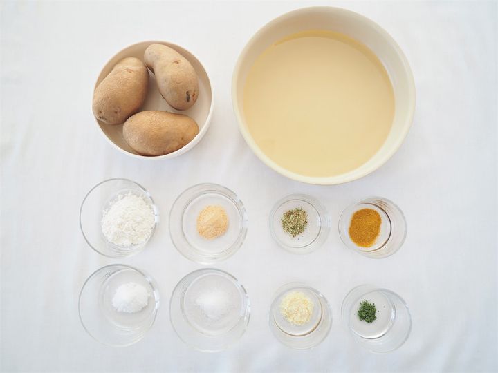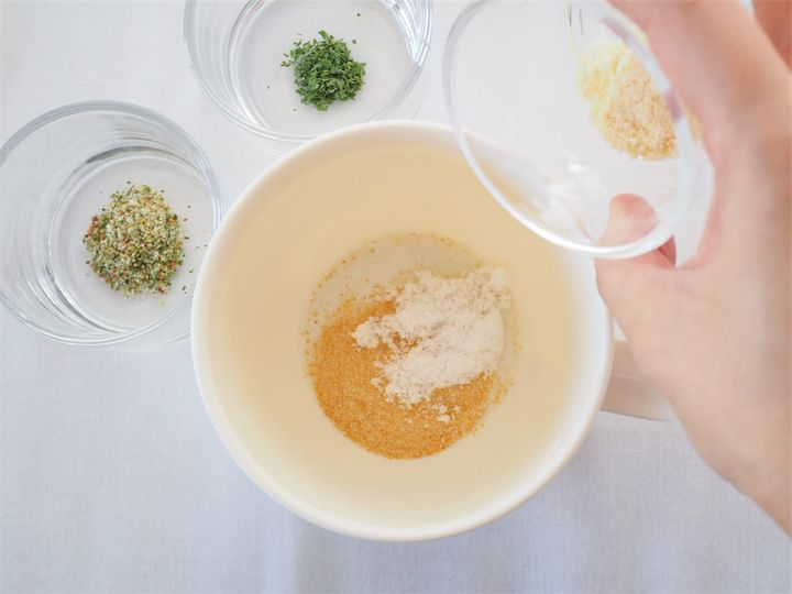 2.  1とは別の器にコンソメ、砂糖小さじ1、粉チーズ、マジックソルト、乾燥パセリを入れよく混ぜる。