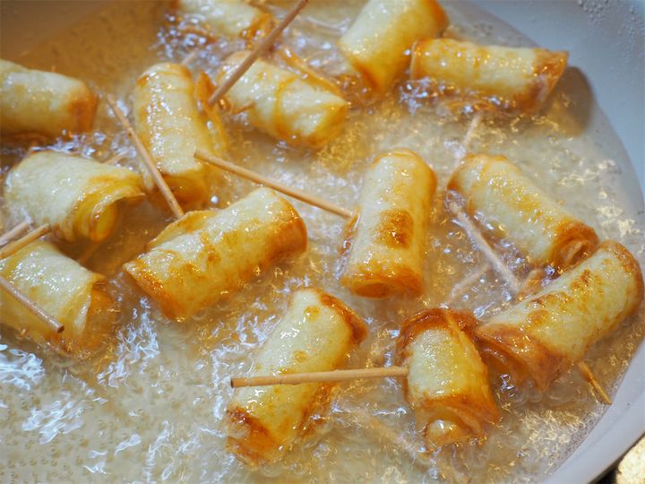 時折空気に触れさせると、カリッと揚がりやすくなるんだそう。焦がさないように注意しましょう!色づいてきたら中火にすると◎揚げ時間は、910でトータル12分くらいが目安。