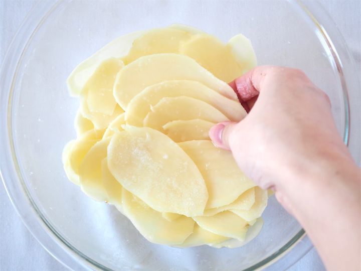 じゃがいもは1つずつ処理していきます。スライスする際は広く平べったい面ではなく、細い面を刃に当ててスライスしていきます。包丁で切る場合は、2mmくらいになるように薄切りにしていきましょう。