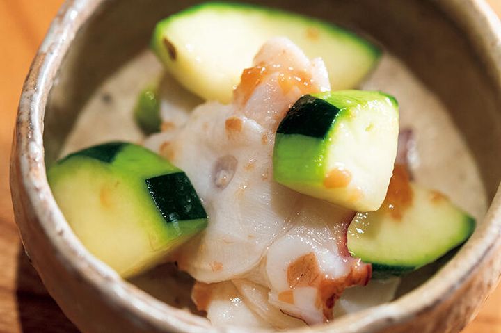 □煎り酒が味を深める“ズッキーニとタコの梅肉和え”