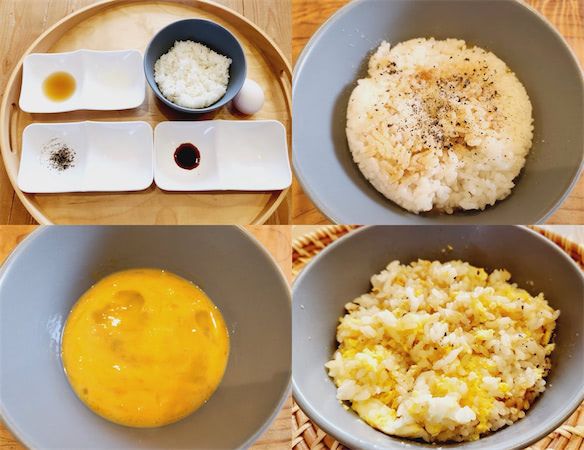 の卵にご飯、塩、しょうゆ、うま味調味料、黒こしょうを入れ、フタをして600Wの電子レンジで2分加熱します。