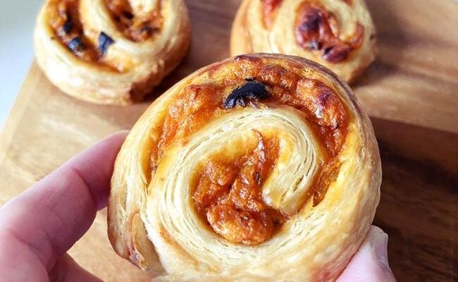発酵バターが使用されている本格派のパンで、焼き立ての香りがたまりません。ひと回り大きく焼き上がったプチパンはクロワッサン生地なので層になっていて食感はサクサク。チーズのフィリングは癖もなくミルキーでとってもおいしいです。