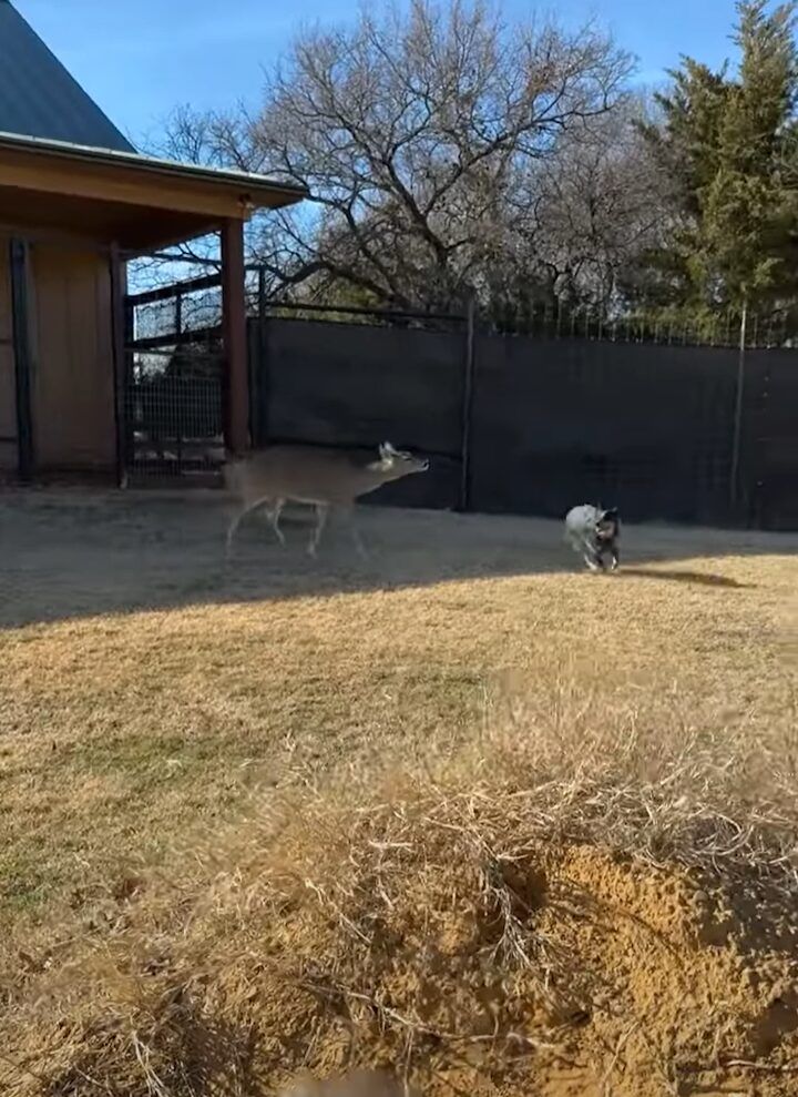 さらに、元気いっぱいに走り回るイヌとシカの姿が! ふたりはお友達なのか、楽しそうに追いかけっこをしていますね。