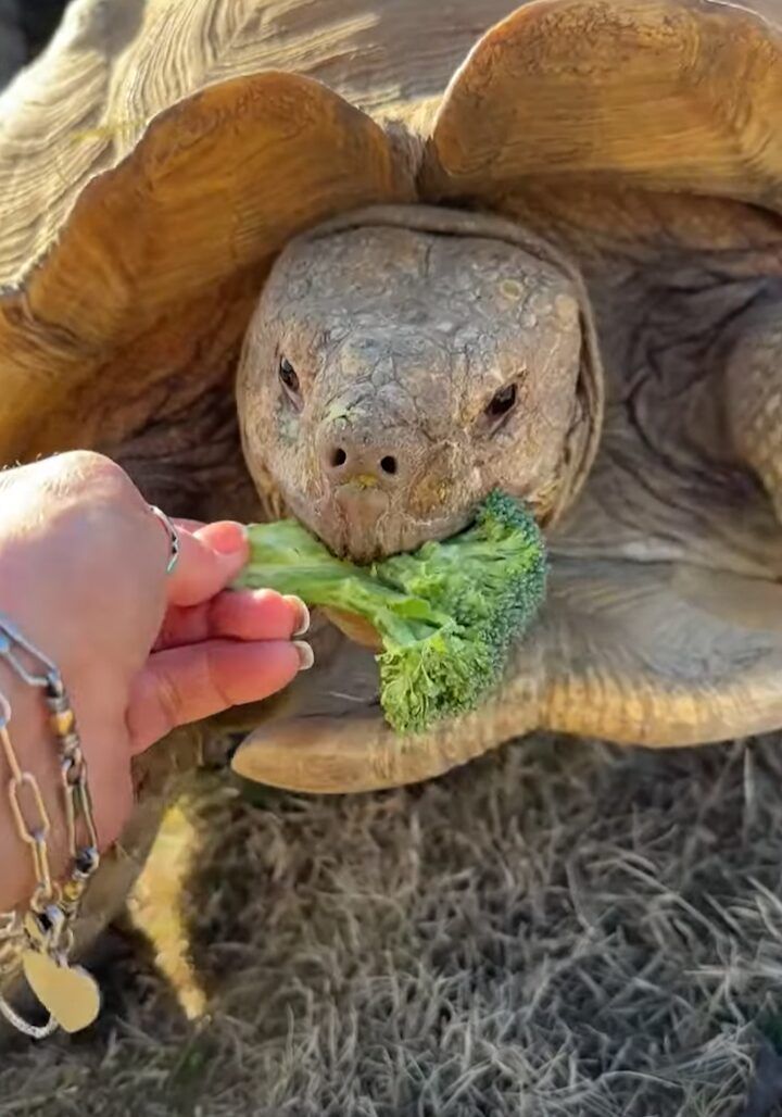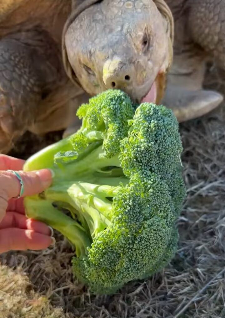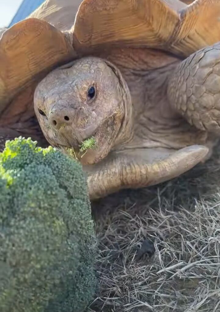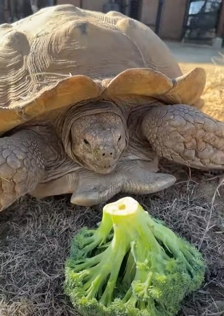 1頭のリクガメの目の前には、大きなブロッコリーが置かれています。 どうやら、この子の食事の時間だったようです。