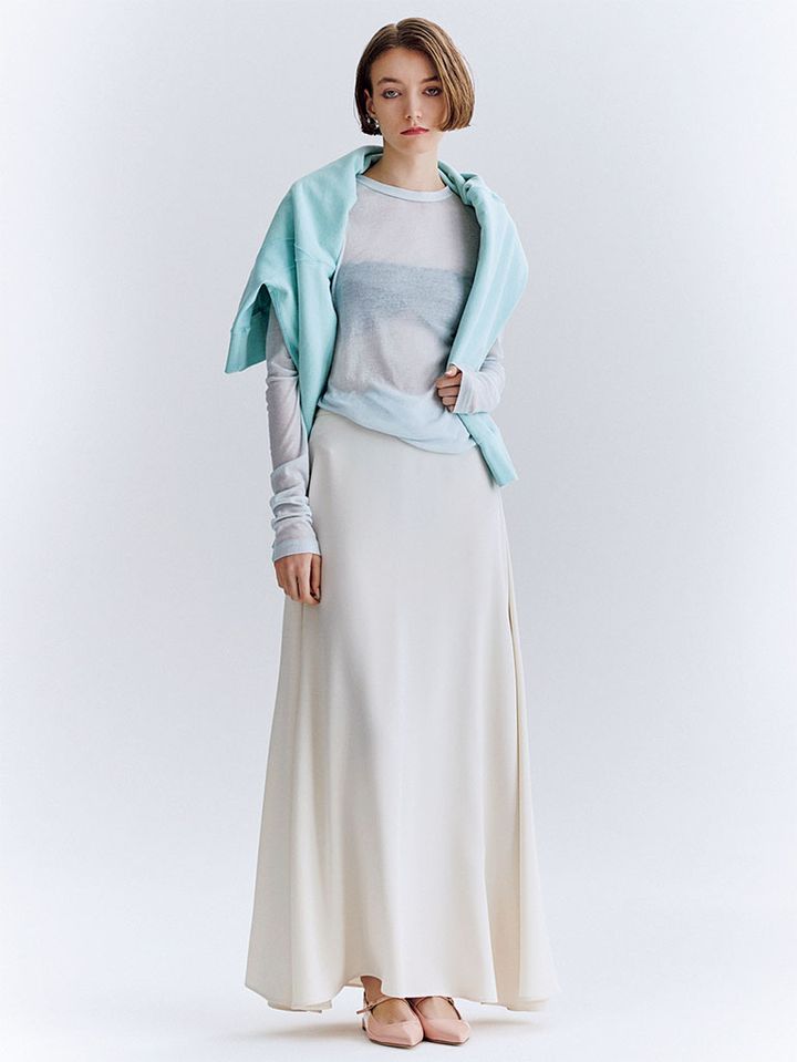 【POINT】ドレープのニュアンスが生き、白でも甘くない落ち着いたムードや陰影による奥行きをスカート1枚で獲得。そんな頼れるボトムを相棒にトップスは澄んだブルーをダブルづかい。装いに軽さを出しつつ、質感の差でメリハリづけてぼやけたシルエットをキリっと調整。