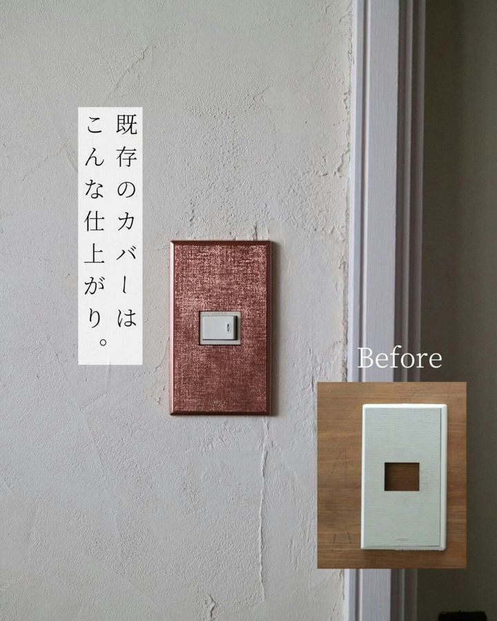 どんなお部屋にも必ずあるスイッチカバー。ここの色が変わるだけで、お部屋のイメージも変わるんですよ。今回は、人気の高い金属風に変身させてみました。便利アイテムを使ってリメイクしていきますよ。それでは方法を見ていきましょう。