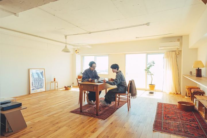 見学で足を運んだ際に、ゆったりした街の雰囲気や住まう人たちが自分たちに合っているなと感じたマンション。廊下や仕切りのあるこもった空間が苦手だと話すorisuさんは角部屋で広く明るい3LDKを、部屋も天井も壁をすべてなくして広々としたワンルームへ変更。