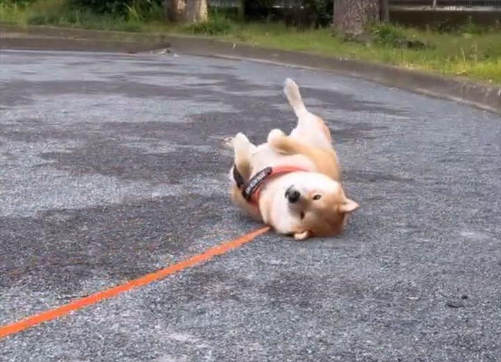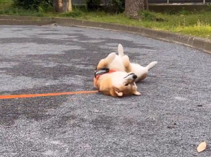 飼い主さんがリードを引く動きに合わせるように、右に左にゴロゴロしています。 なんとも愛らしい行動です。
