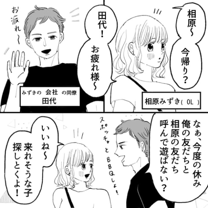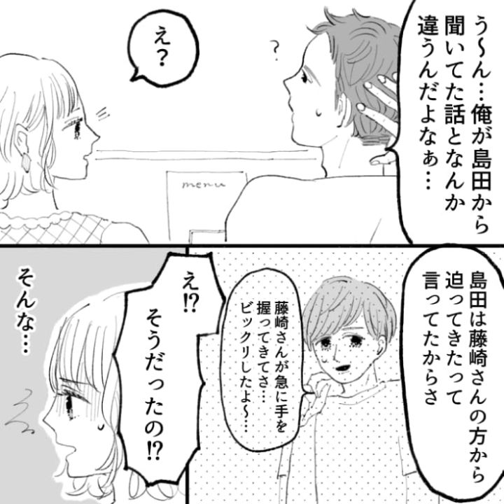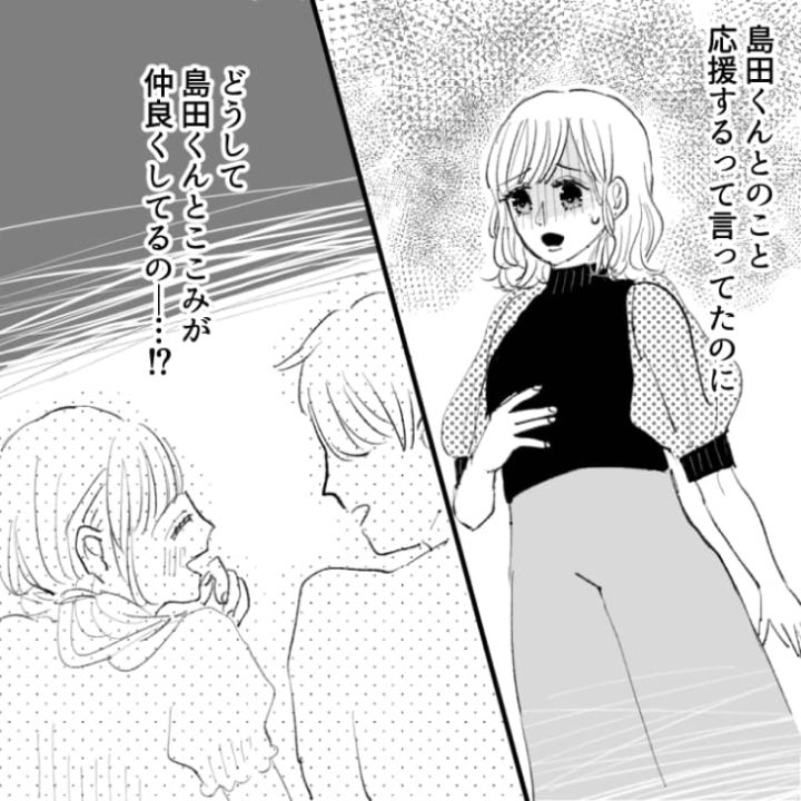 バイト先の同僚である田代と、友だちを集めて遊ぶことになった主人公。そこに来ていた島田くんに惹かれ、主人公は島田くんが気になっていることを友達のここみちゃんに報告しました。ここみちゃんは応援する!と言ってくれたのですが・・・。