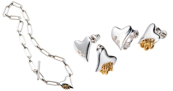 シャープで厚みを抑えたハートモチーフだから甘い印象になりすぎず、でも遊び心と存在感は抜群。カジュアル服にもしっくり。ゴールド×シルバーのMIXデザインだから、手持ちのジュエリー合わせに悩まず、多彩なコーデを楽しめます。