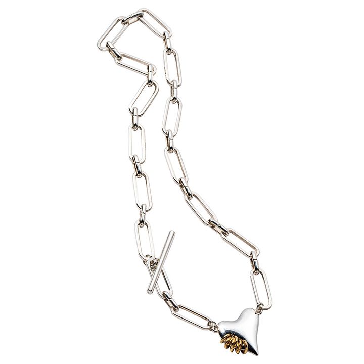 デフォルメされたハートが目を引くデザイン。存在感のあるチェーンながらも軽く、長時間つけても快適。長さは39cmで、錫合金・真鍮を使用。