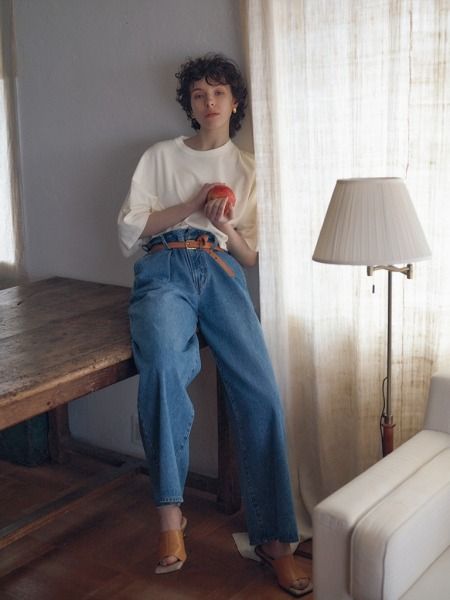 すそからウエストまで太く直線的な、ベルトを締めて着る前提のワイドデニムが登場。ワンサイズ上を着ているかのようなはき口の余りが、上半身も下半身もきゃしゃに見せてくれる。合わせるTシャツもゆるいほど抑揚がつく。