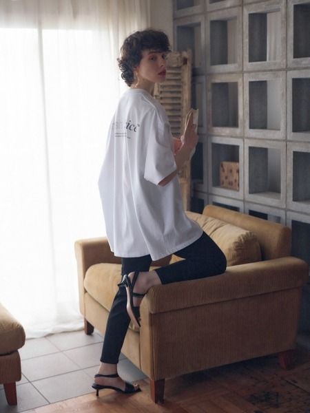 お尻まですっぽりと隠れるTシャツのフォルムを生かすため、黒スキニーを抜擢。肉感を拾わないほどよい厚みと伸縮性で、レギンス並みにストレスフリー。