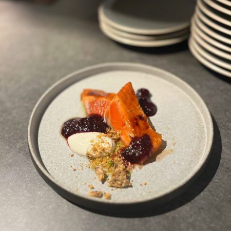 お魚は、「炙り〆サクラマス バルサミコベリーと麹フロマージュブラン」はいかが。炙りしめさばならぬ、炙り〆サクラマスは、バルサミコやブルーベリーの酢につけたフルーティーな味わい。