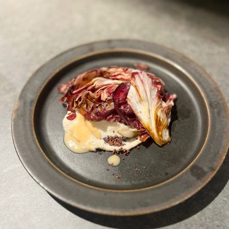 例えばヴィーガン対応の前菜「軽く焼いたトレビス 白いんげん豆のペースト」は、ちょっと甘めの白いんげん豆のペーストがほろ苦いトレビスによく合います。