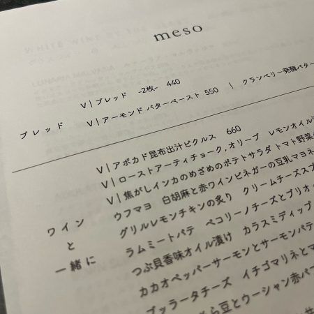 meso 東京都世田谷区北沢3-30-3 下北沢シャルモット 1階 03-6407-0369 営業時間:月・火・金 17:00 - 22:30、土・日・祝日 15:00 - 22:30 定休日:水・木 https://www.instagram.com/meso_shimokitazawa/